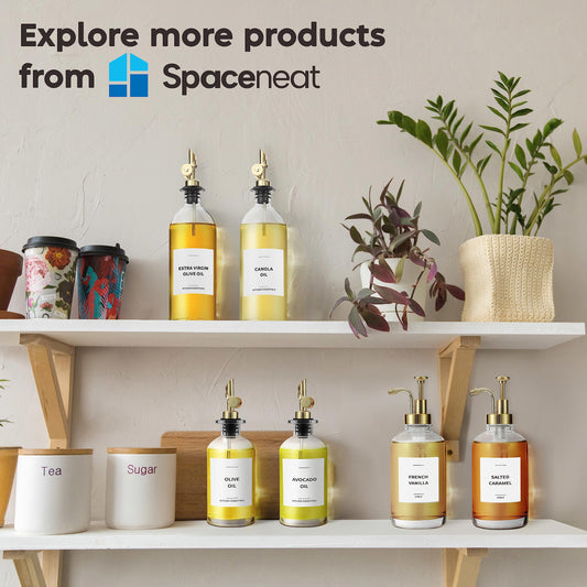 Spaceneat Olive Oil Dispenser Bottle - Includes 55 Kitchen Essential Labels - Cooking Oil Bottles for Kitchen, Coffee Syrup Dispenser - Pourer Spout with 11.8 fl oz Glass Container Cruet - 2pcs, Gold
