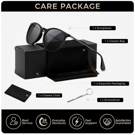 SUNGAIT Vintage Round Sunglasses for Women Men Classic Retro Designer Style (Black Frame(Matte Finish)/Polarized Grey Lens) 1567 PGHKH