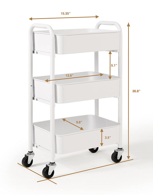 SunnyPoint 3-Tier Delicate Compact Rolling Metal Storage Organizer - Mobile Utility Cart Kitchen/Under Desk Cart with Caster Wheels - WHT (15.35" X 10.24" X 26.8"H)