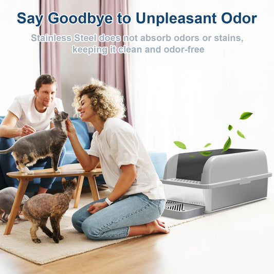 Suzzipaws Enclosed Stainless Steel Cat Litter Box with Lid Extra Large Litter Box for Big Cats XL Metal Litter Pan Tray with High Wall Sides Enclosure, Non-Sticky, Anti-Leakage, Easy Cleaning