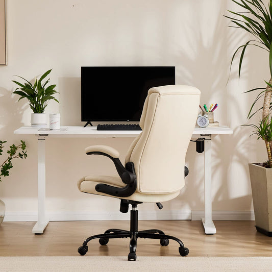 Sweetcrispy Computer Gaming Chair, Ergonomic High Back Heavy Duty Task Desk Office Chairs with Wheels, Flip-up Arms, Adjustable Height, PU Leather, Cream