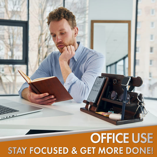 TESLYAR Wood Phone Docking Station for Men - Desk or Nightstand Organizer - Birthday Gifts for Husband, Dad - Anniversary Idea from Wife - Key Holder, Stand Wallet, Watch & Essentials (Bourbon Brown)