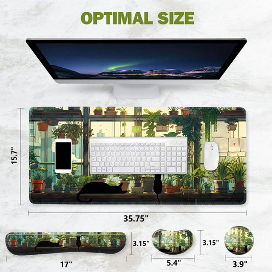 ToLuLu Extended Gaming Mouse Pad, Memory Foam Ergonomic Keyboard Mouse Wrist Rest Support Set, Large Desk Mat with Stitched Edges, Non-Slip Base Mousepad Home Office, Cute Green Japanese Kawaii Cat