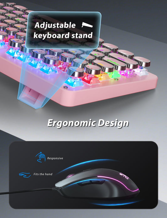 Typewriter Mechanical Gaming Keyboard and Mouse, Metal Panel Retro Keyboards with Round Keycap Blue Switch, Rainbow LED Backlit 104-Key Anti-Ghost Wired Mouse and Pad Combo for PC Laptop Mac Gamer