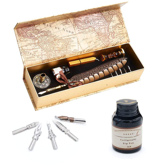 GC QUILL Antique Quill Pen Unique Half-Patterned Feather Pen Set with 6 Nibs 1 Bottle of Ink 1 Seal Stamp 1 Pen Holder 1 Sealing Wax LL-149