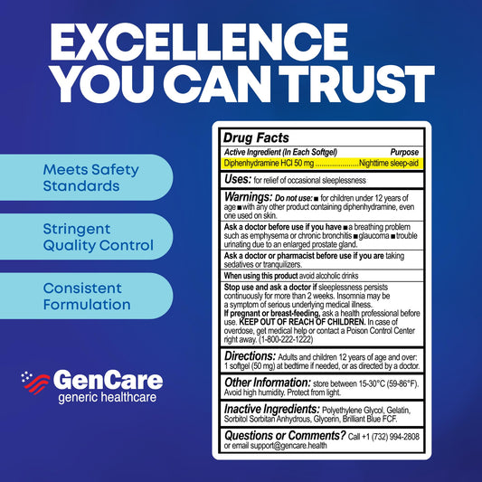 GenCare Maximum Strength Nighttime Sleep Aid Supplement for Adults Deep Sleep Pills with Diphenhydramine HCl 50mg to Fall Asleep Faster- Strong Non-Habit Forming PM Sleeping Relief [96 Softgels]