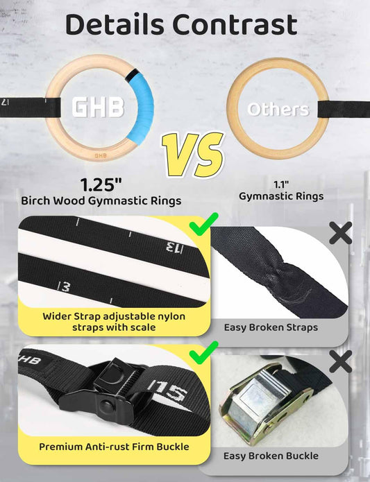 GHB Gymnastic Rings Wooden Gym Rings 1.25" Olympic Rings Adjustable Straps Pull Up Rings Sets for Workout Bodyweight Fitness Training