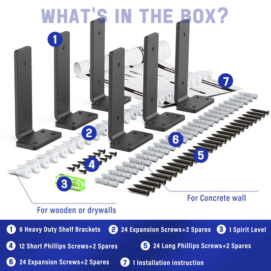 Goovilla Shelf Bracket, Heavy Duty Floating Shelf Brackets 6 inch Long, 6 Pack Brackets for Shelves, Black Coated Metal Wall Shelf Support Brackets with 1/5 Inch Thick and 160 lb. Load Capacity