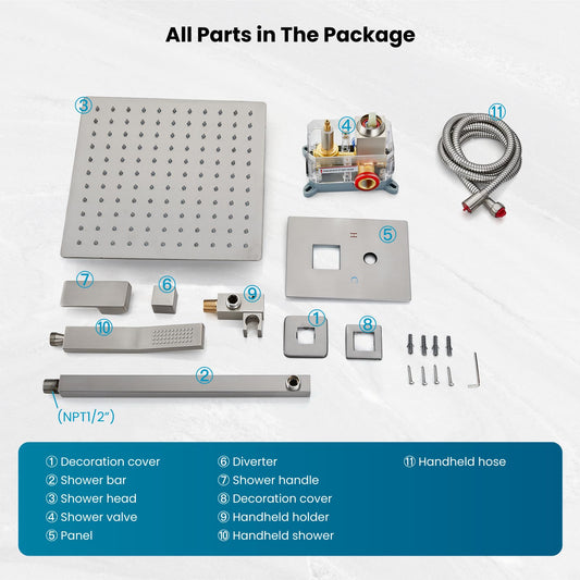 gotonovo Rainfall Bathroom Shower System Rain Shower Head and Handle Set Wall Mounted Shower Complete Combo Solid Brass Pressure Balancing Shower Mixer Valve 12 Inch Brushed Nickel