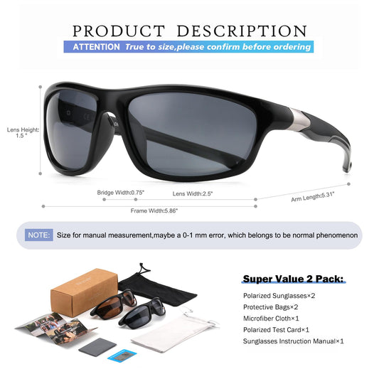 2 Pack Polarized Sports Sunglasses for Men Women, TR90 Wrap Around Design Sun Glasses UV400 Protection Outdoor Driving Cycling Fishing Black+Tortoise