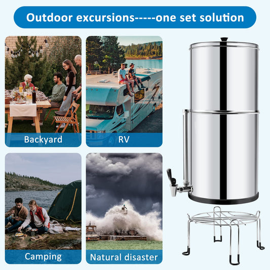 2.25 Gallon Stainless Steel Gravity-fed Water Filter System with Black Activated Carbon Filter and Fluoride Filters for Home, Camping, Travel, Outdoor Adventures and Emergencies - 2 Year Warranty