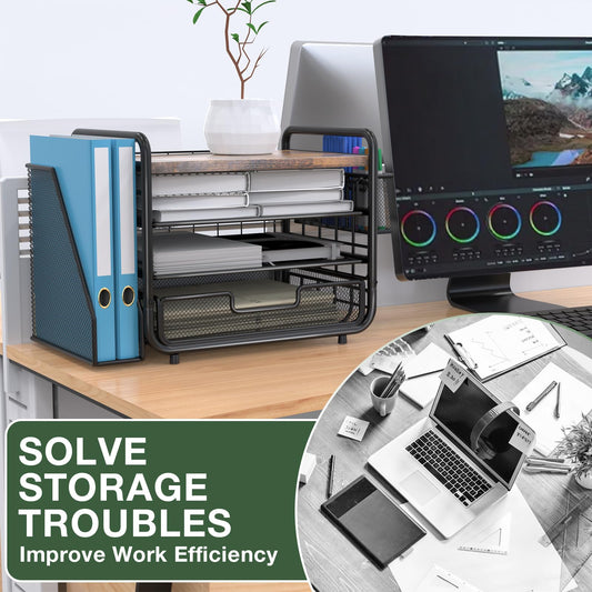 2025 New Large Capacity Desk Organizer with Drawer, Wooden 4-Tier Paper Organizer Letter Tray with File Holder and Pen Holders, Wooden Desk Accessories for A4 Paper Work Folder Storage (Style1)
