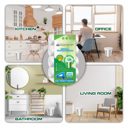 220 Counts Aklyaiap 4 Gallon Trash Bag,Tear & Leak Resistant Bathroom Biodegradable Small Garbage Can Bags Unscented for Home & Kitchen, 5Rolls, White