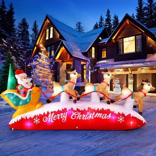 10FT Long Christmas Inflatables Santa Claus with Reindeer Sleigh Outdoor Decorations, Build-in Rotating Colorful LEDs Santa Blow up Yard Decoration for Holiday Xmas Party Indoor Lawn Christmas Eve
