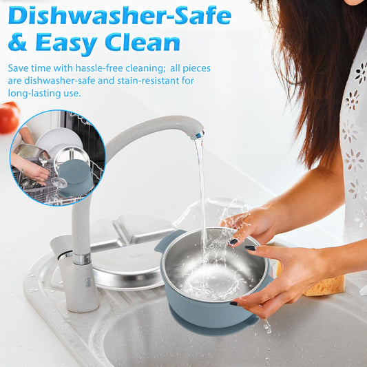 Silicone Feeding Set,Stainless Steel Suction Plate,Baby Utensil Set.Include a Spoon,a Fork, a Plate,a Stainless Steel Kids Bowl.