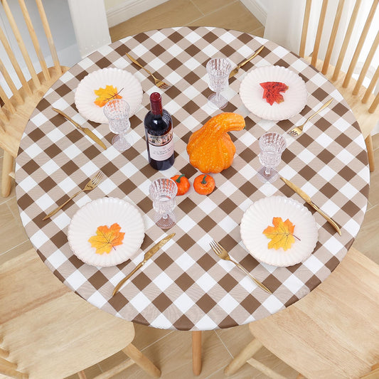 Smiry Round Picnic Tablecloth, Elastic Waterproof Fitted Vinyl Tablecloths for 45"-56" Tables, Flannel Backed Buffalo Plaid Table Cover for Dining, Camping, Outdoor, White and Brown