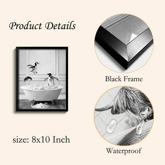 Ardakar Framed Bathroom Decor Wall Art, Black and White Bathroom Decor, Funny Wall Decoration Animal Penguin in Bathtub Posters, Cute Animal Wall Art for Kid's Room (Framed,8''x10'')