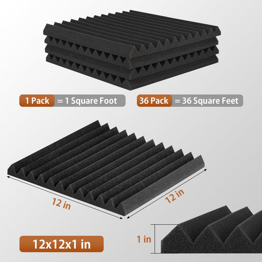 SD SODOCT 36 Pack Acoustic Foam Panels with Self Adhesive 12" X 12" X 1" Sound Proof Foam Panels for Walls High Density Wedge Soundproof Wall Panels for Studio Office Gaming Room
