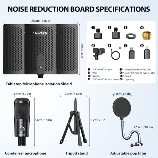 Studio Recording Microphone Isolation Shield with Pop Filter and Metal Tripod Stand USB Condenser Mic to PC Laptop Smartphone, Mic for Recording Singing Podcasting