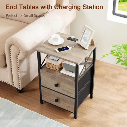 AMHANCIBLE Night Stand, Nightstand with Charging Station, End Tables Living Room with Fabric Drawer, Bedside Table with USB Ports and Outlets for Small Spaces Bedroom, Greige HET05XGY1