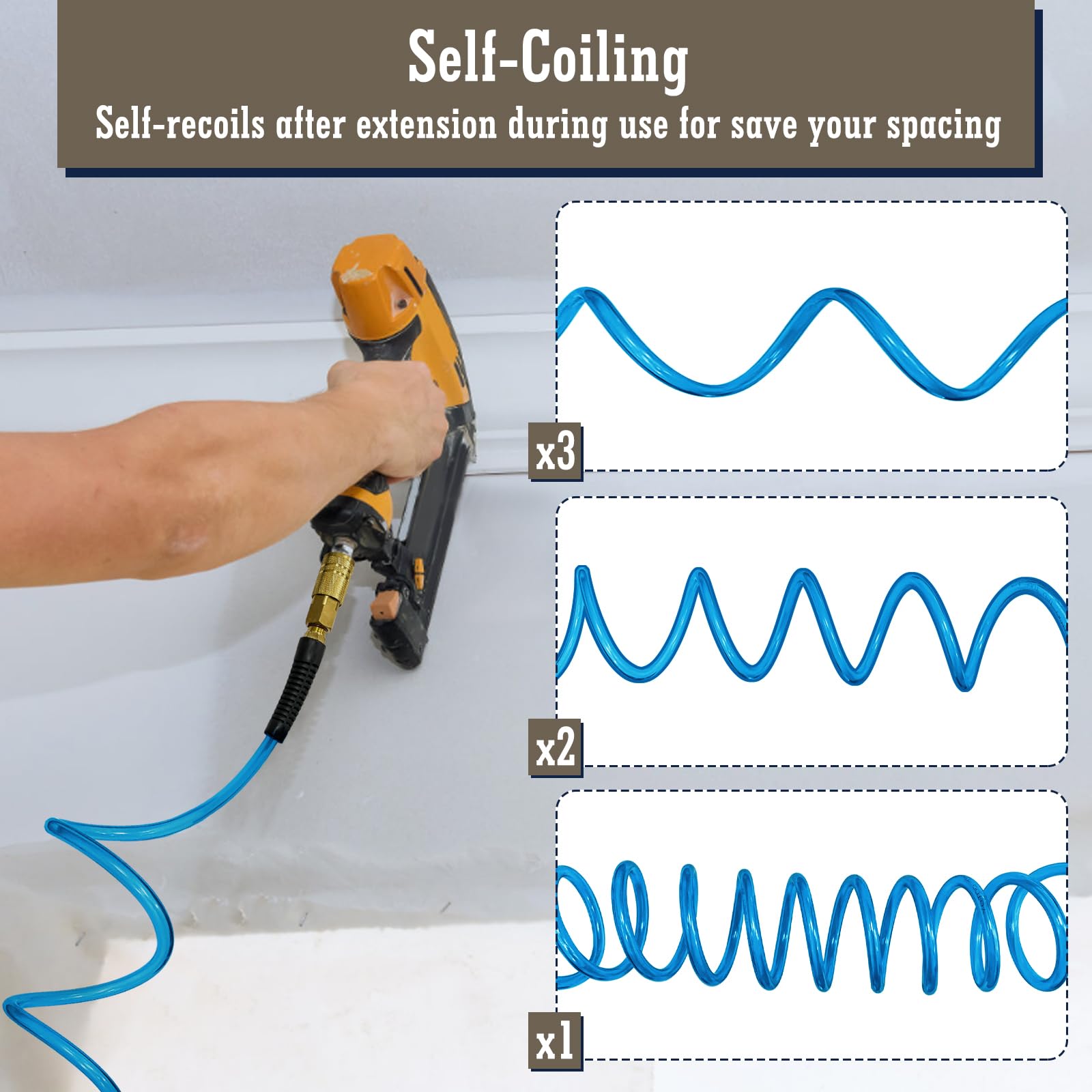 • AIR HOSE QUICK CONNECT:This coiled air hose is the ultimate tool for all your pneumatic needs! This air compressor hose features 1/4 inch quick-connect fittings and I/M Plug on both ends, making it easy to install and use. Whether you're working on a construction site or in your garage, this air line is the perfect tool to have on hand.