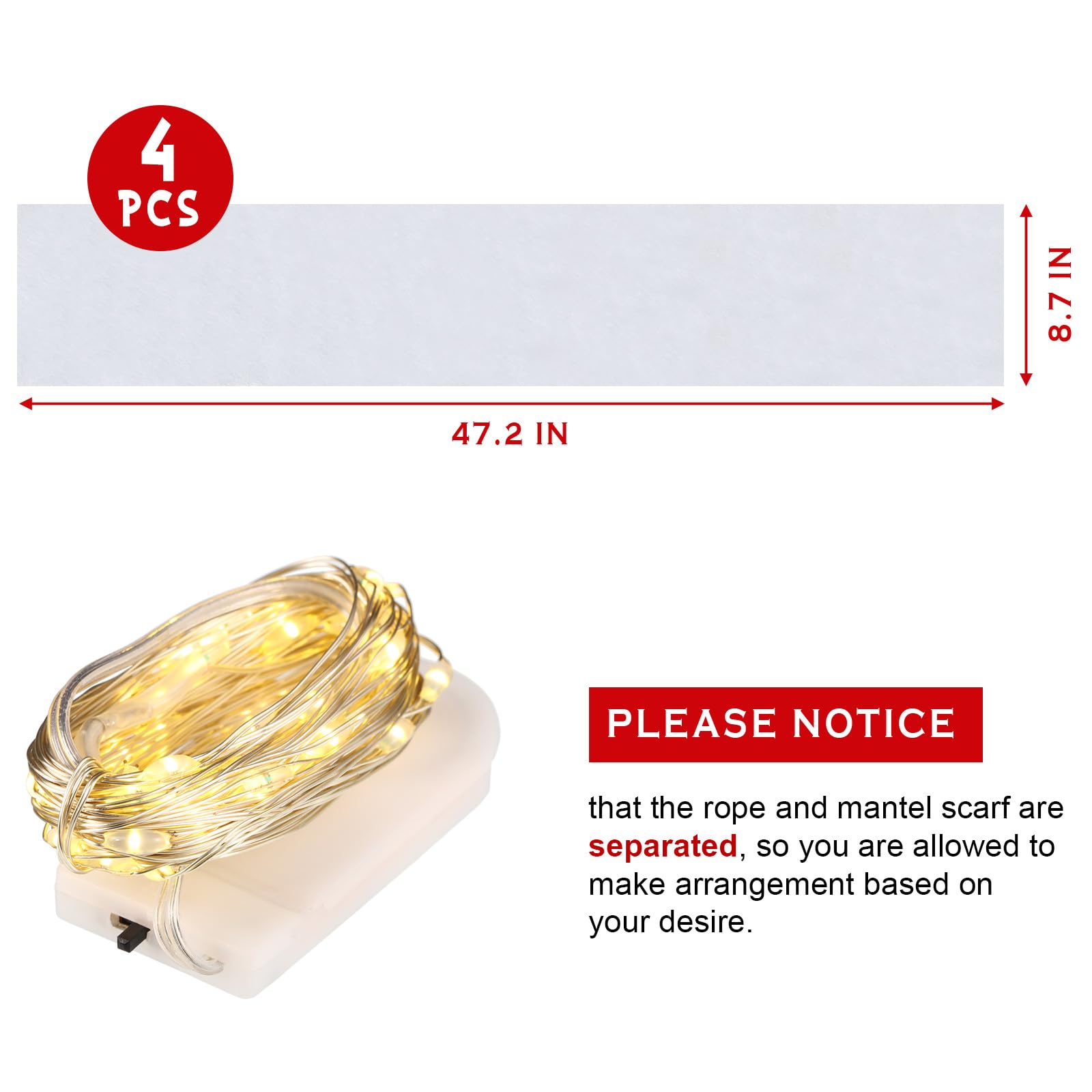 • DIY Creation: the rope and fireplace scarf are separate and need to be installed by yourself; According to your own ideas, put most of the LED light string under the blanket, install accessories, the light string uses 3 AA batteries (not included), turn on the switch; There are 16.4 feet 50 inches of LED wire to decorate your snow fireplace