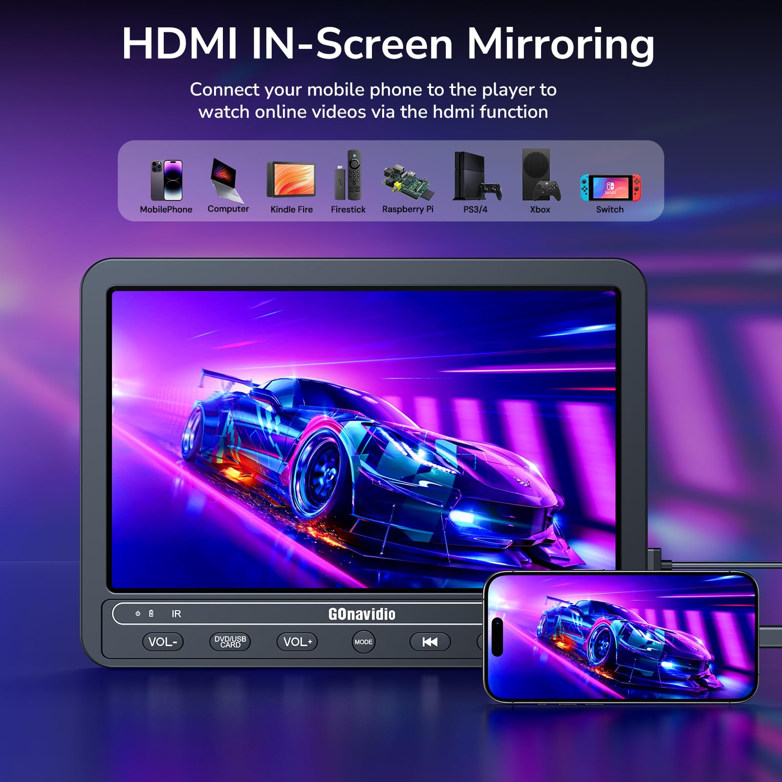 10.5 Inch DVD Player for Car with 5-Hour Battery, Headphones, Headrest DVD Player Support HDMI Input, Sync Phone/TV, 1080P Videos, USB SD, Last Memory, Region Free