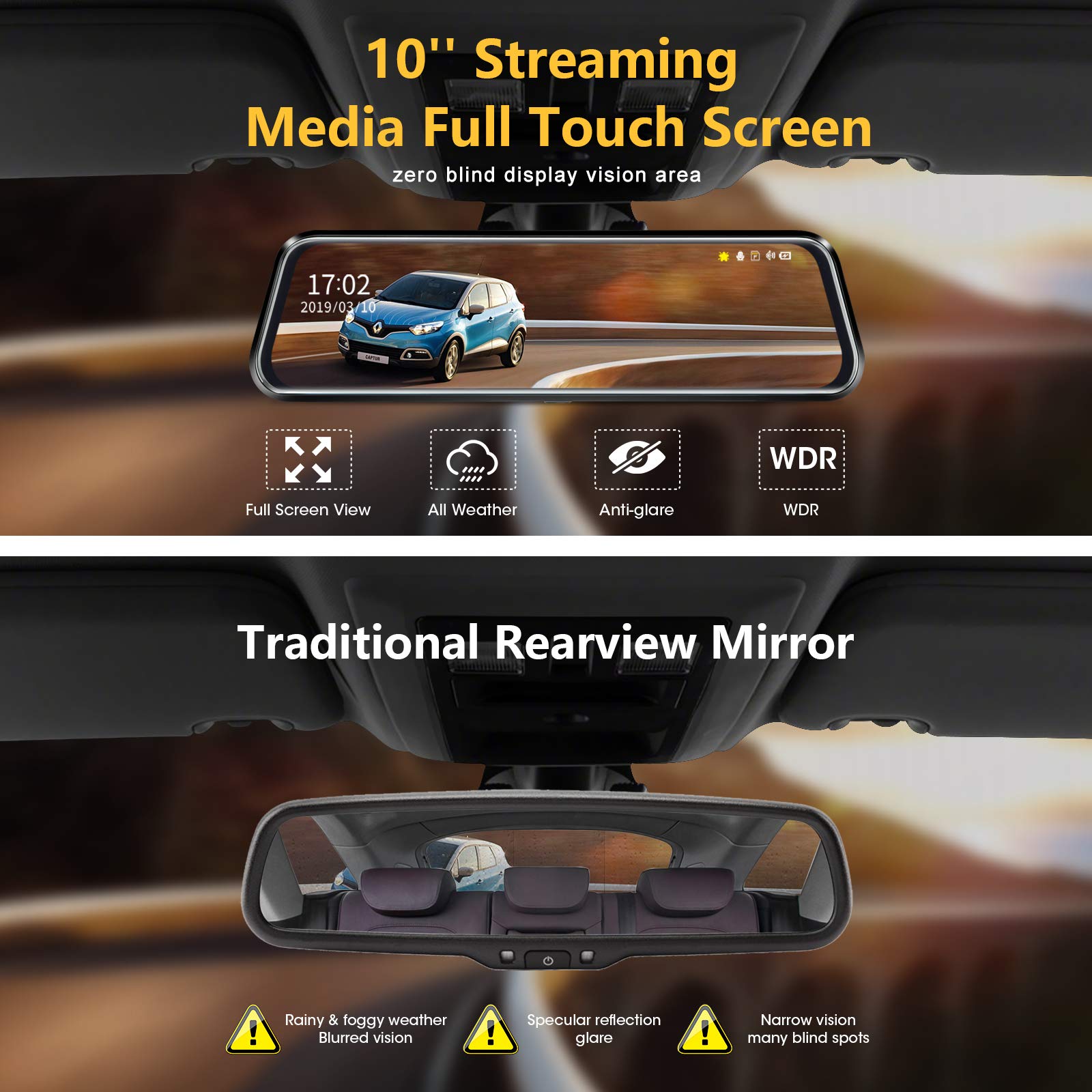 • 10'' IPS Streaming Media Full Touch Screen: 10 inch screen provides 3 times wider view than traditional rear view and can capture more road vision. Streaming media full touch screen, easier to operate, fast response speed. Execute dash camera with a simple touch various operations: switch the front and rear camera images by sliding left and right, adjust the viewing angle by sliding up and down, video recording/playback, exposure adjustment, screen brightness adjustment, date/time, etc.
