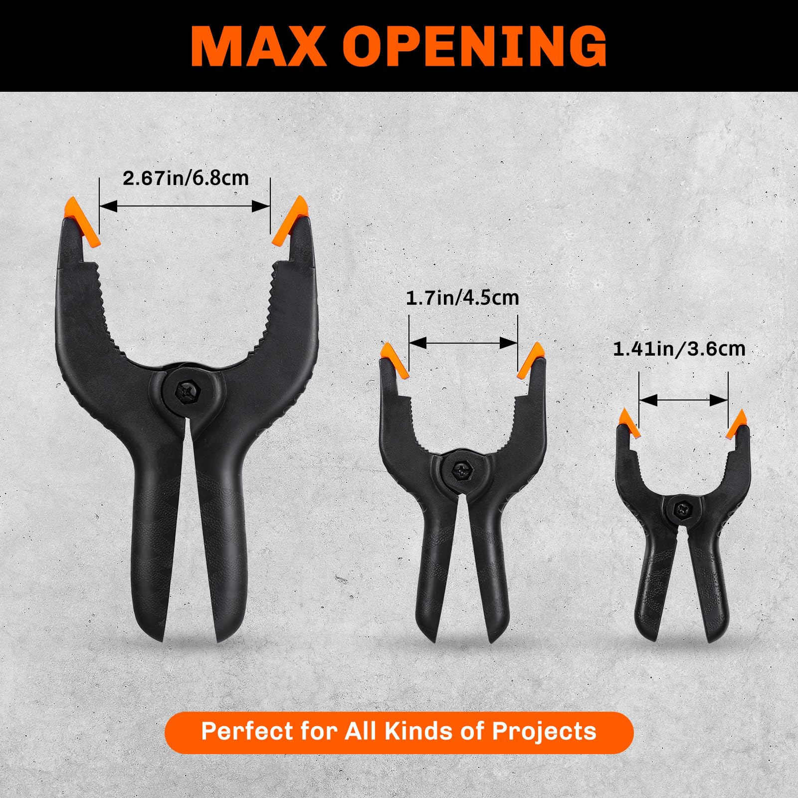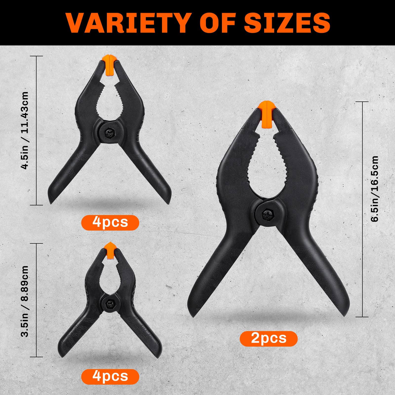 • THREE BIGGER SIZES: Our 10-pcs spring clamp set comes in three sizes - 6.5 inches ×2pcs, 4.5 inches ×4pcs, 3.5 inches ×4pcs. The plastic clamps ensure that you have ample supply for multiple tasks simultaneously.