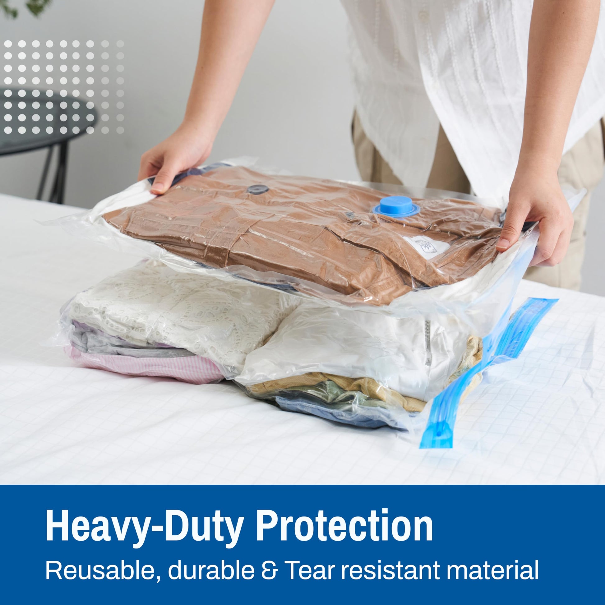 • Easy to Use with Any Vacuum: Compatible with hand vacuum pump. Just fill the bag, seal it, vacuum out the air, and you're ready—perfect for travel, temporary or long term storage.
