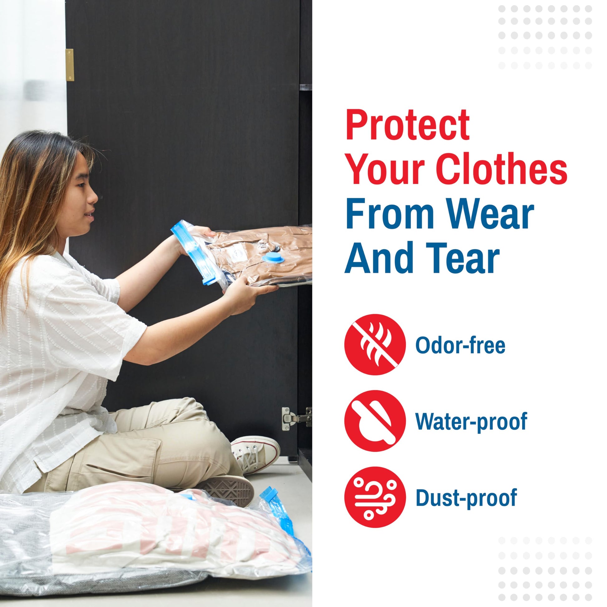 • Airtight & Waterproof Seal: The double zip seal and triple-seal valve on these vacuum travel bags provide airtight protection, keeping your items safe from dust, dirt, moisture, and odors—ideal for clothing storage bags.