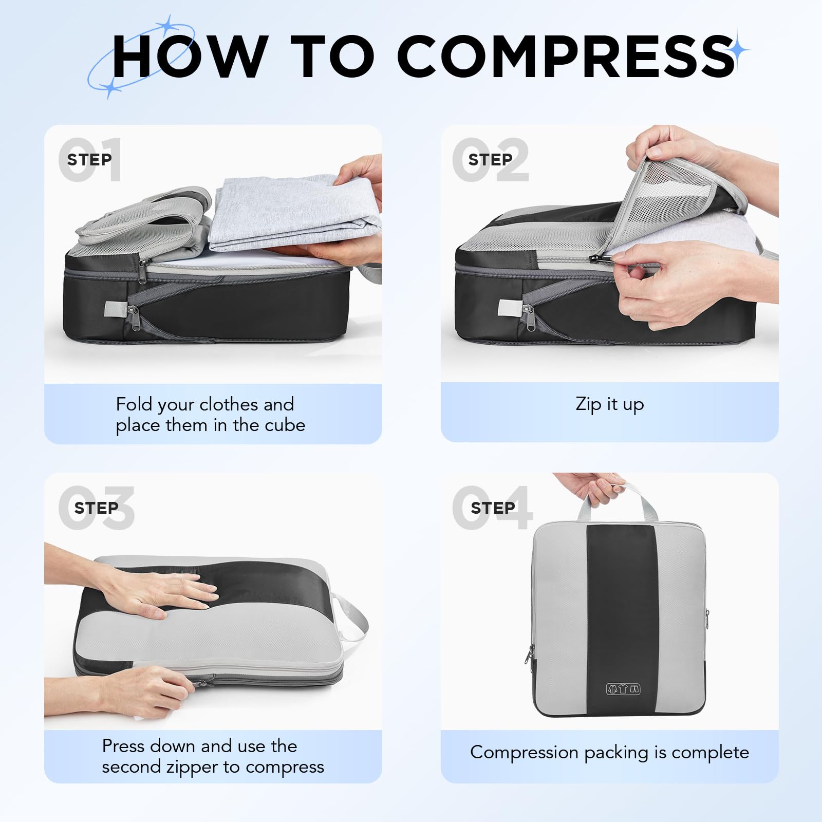 • Maximize Packing Efficiency - Make every inch of your luggage count! These compression cubes work like a mini vacuum sealer, using an extra outer zipper to reduce bulk and create more space. Pack more clothes without sacrificing options—your favorite outfits, now travel-ready.