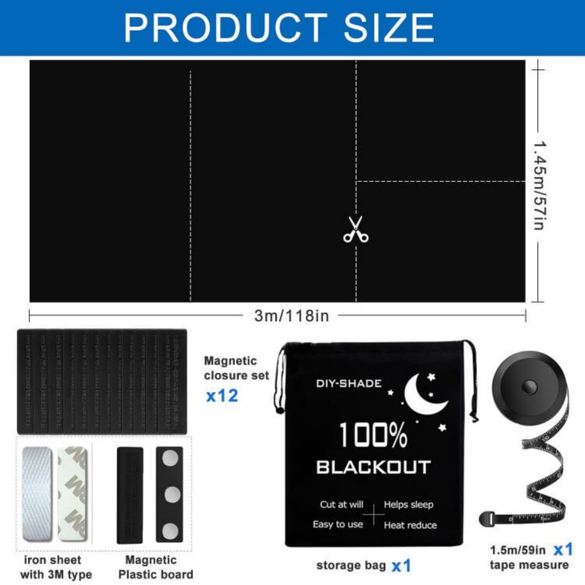 • 【Pack list and notice】You Can Get 1 Pcs 118"x57" Blackout Shades, 1 Pcs Soft Ruler, 12 Pair Magnetic Fasteners, 1 Pcs Storage Bag. Notice -The Magnets Actually Hold The Piece Of Fabric In Between Them Vs Actually Being Adhered To The Fabric,The Silver Metel Board With Adhesive, Eit Should Attached On The Window Frame And The Magnetic Board Without Adhesive, It Should Fix On The Blackout Blind Window Cover.