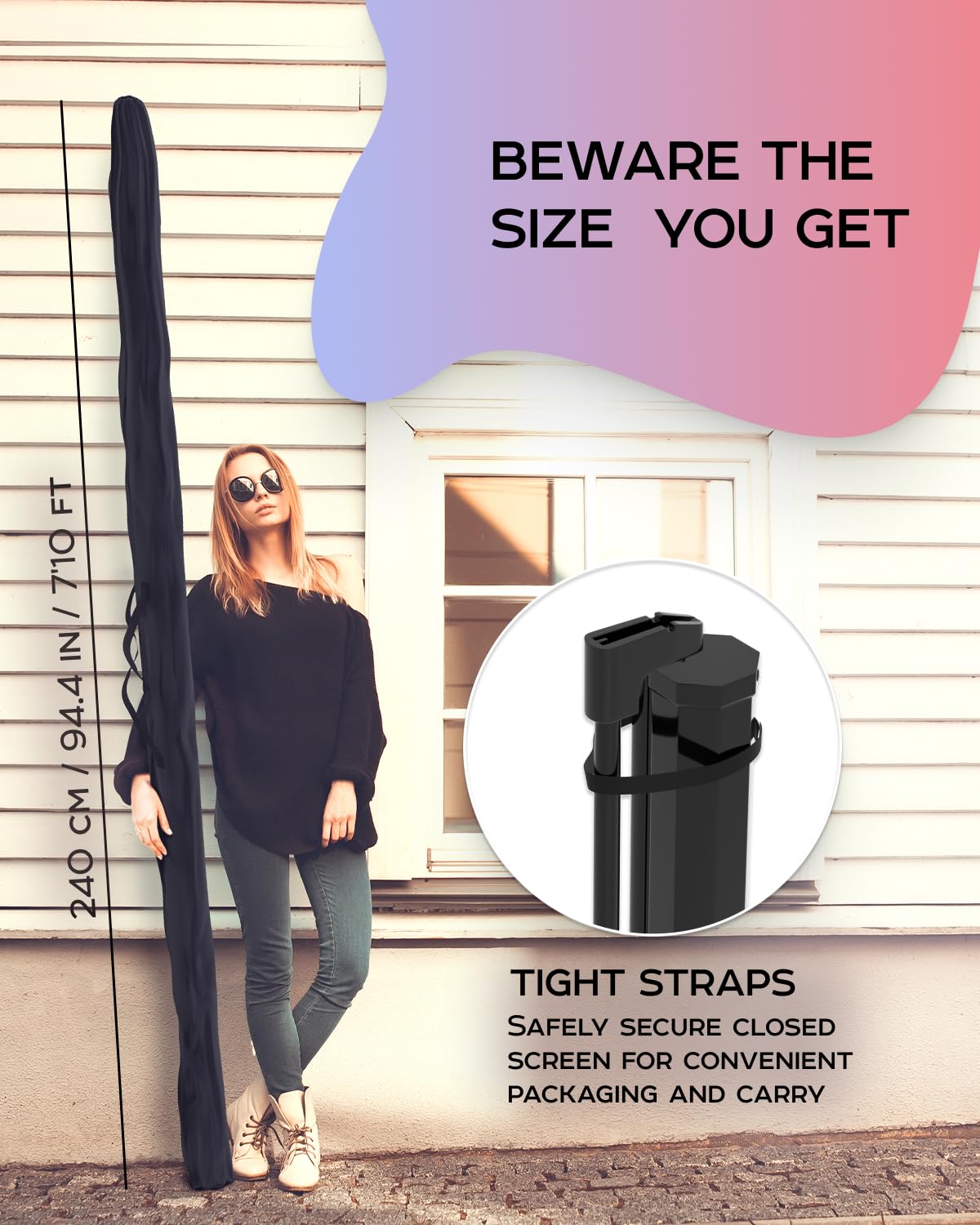 • Indoor Outdoor projection movie screen is secured by convenient tight-straps, it could be carried to backyard or auditorium in a perfectly fitted projector screen bag, its retractable and adjustable design can be easily assembled in 3 steps.