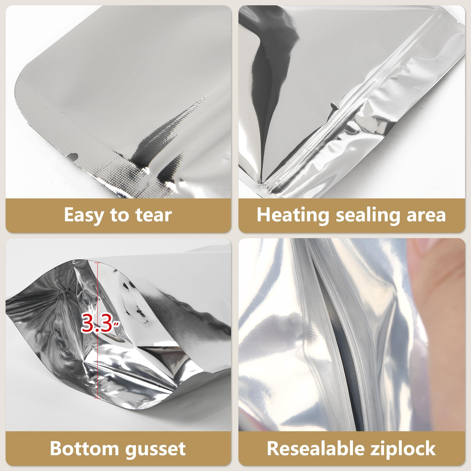• Material: Premium material. One side is aluminum, another side is clear plastic; Premium tight resealable ziplock: Keeps all water and moisture out and any odors in when sealed. This stand up bags are Sturdy, Strong Sealing, Reusable. Perfect choice for storage and keep your food fresh.