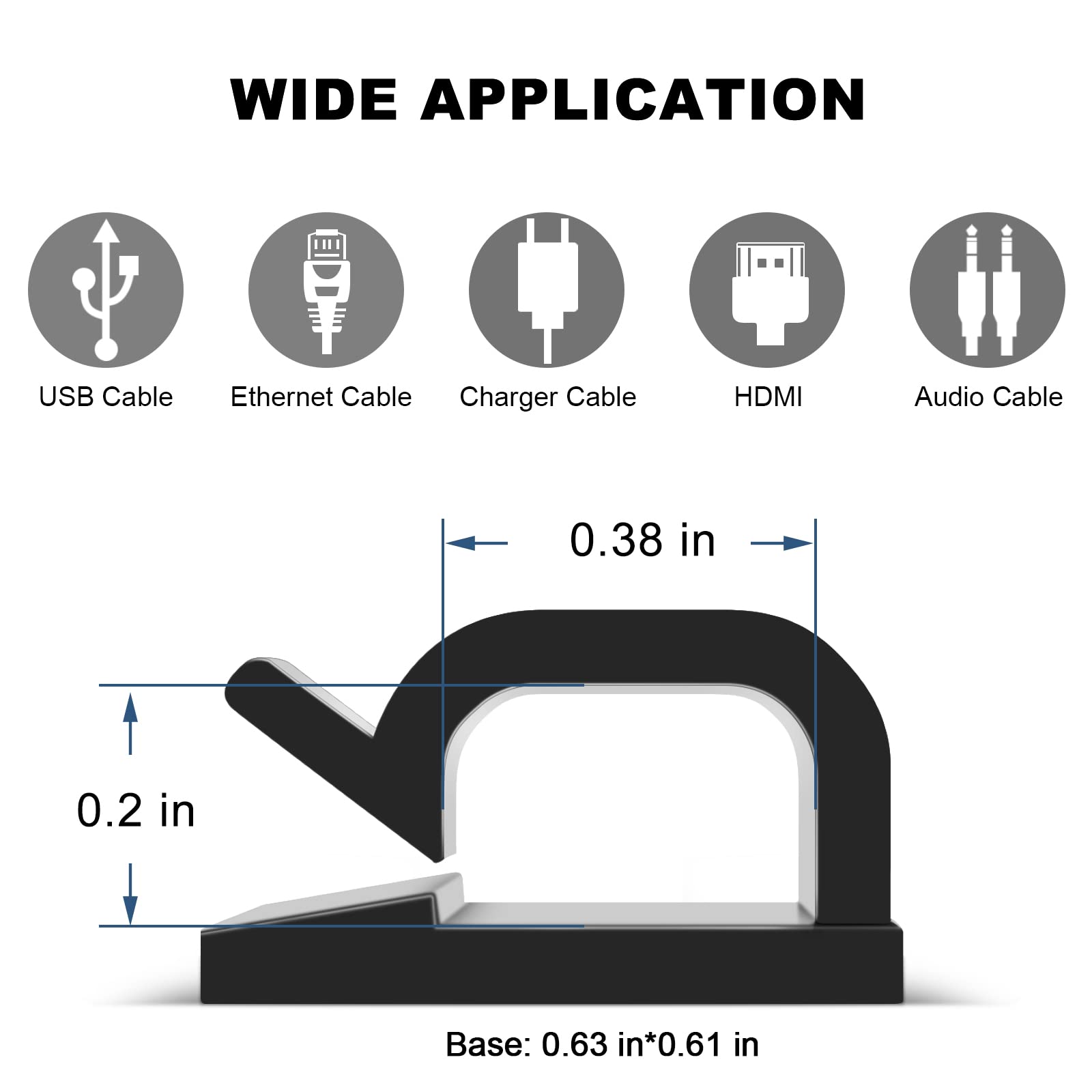 Size information: Base 0.63’’ x 0.61’’, Height 0.33’’, our cable management clips suitable for wire diameter within 0.2’’: USB cable, phone charger, ethernet cable, cat 6, car dash cam, LED Strip Light.