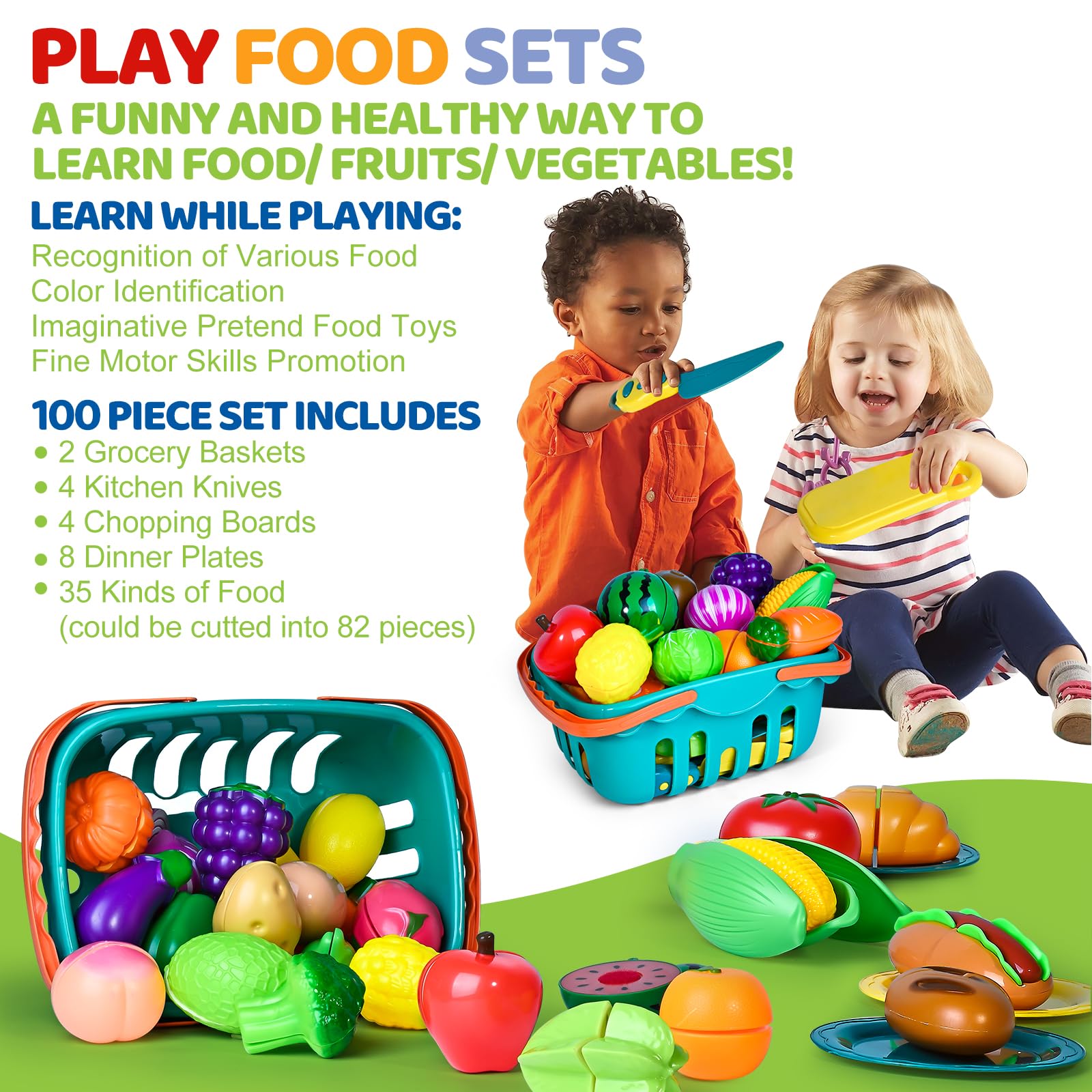 100 PCS Cutting Play Food Toy for Kids Kitchen, Pretend Food Toys for Toddlers, Play Kitchen Toys Accessories with 2 Baskets, Fake Food/Fruit/Vegetable, Birthday Gifts for 3 4 5 Years Old Boys Girls