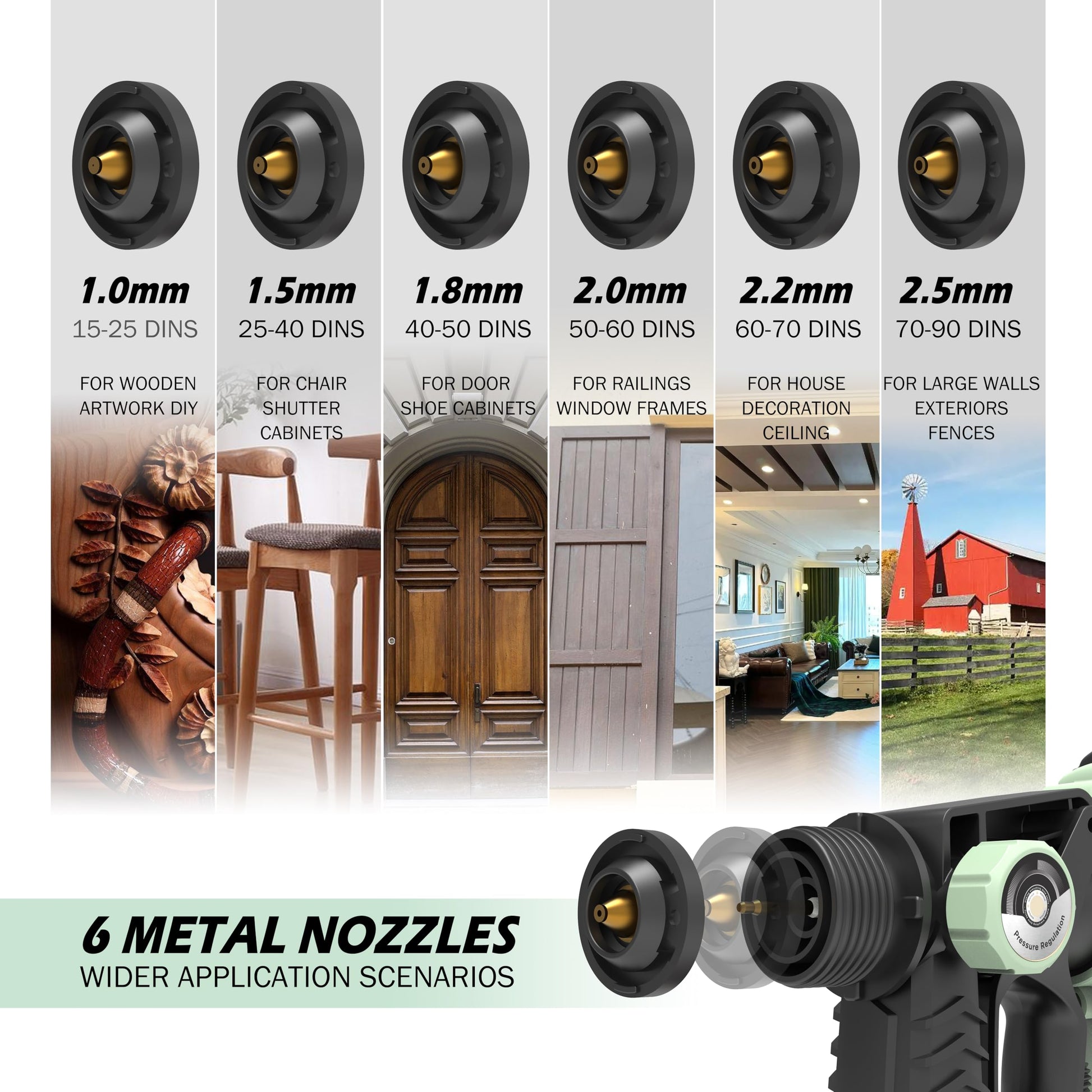 • 【Precision Control Spray Technology】 Customize your workflow with adjustable spray patterns + 6 nozzle sizes (1.0mm、1.5mm、1.8mm、2.0mm、2.2mm、2.5mm). Switch seamlessly between detailed trim work and broad surface coverage while maintaining consistent material flow control for flawless finishes.