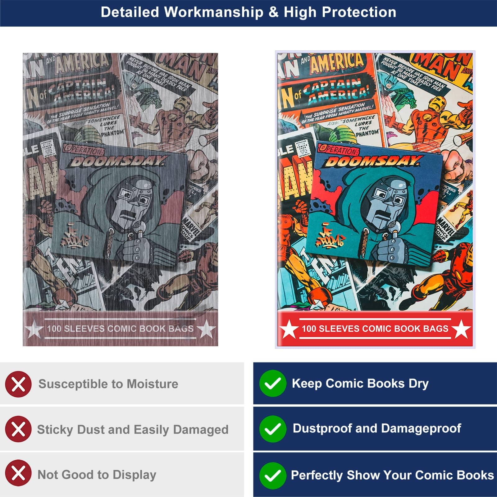 Premium Material - Made from durable and crystal clear plastic, our Comic Book Bags are designed to keep your comics safe from dust, moisture, and fingerprints, while the sturdy Comic Book Boards provide additional support and prevent bending or creasing.