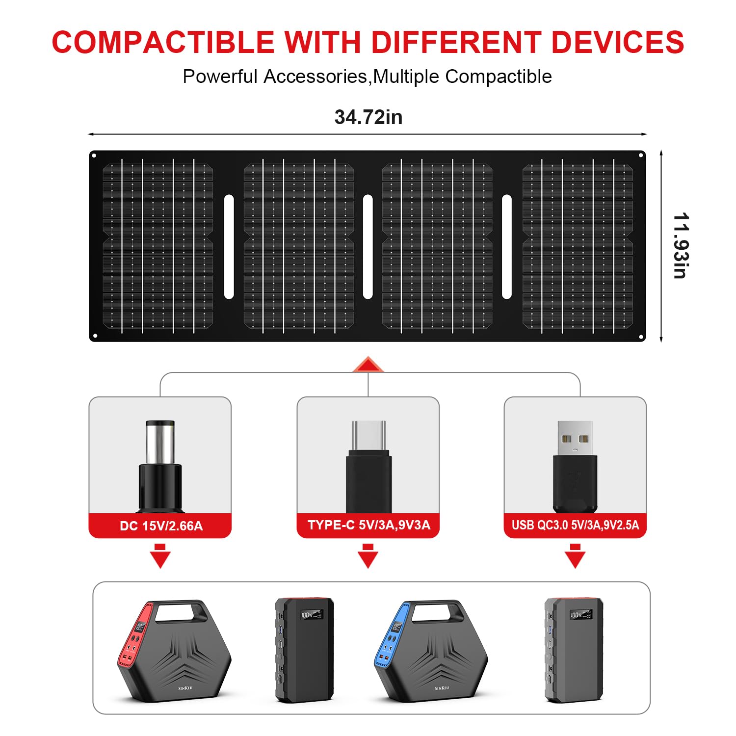 • Wide Compatibility Solar Panel: 40W solar panel for power station come with 10*DC adapters, compatible with most portable power stations/solar generators on the market. The 40W solar panel for camping designed with 3 output ports of different type: 1* DC output (18V/2.27A Max), 1*USB-C Output, 1* USB QC3.0. Wherever you are, it can charge your phone, iPad, laptop, mini fridge, camera, GPS, power bank and other devices