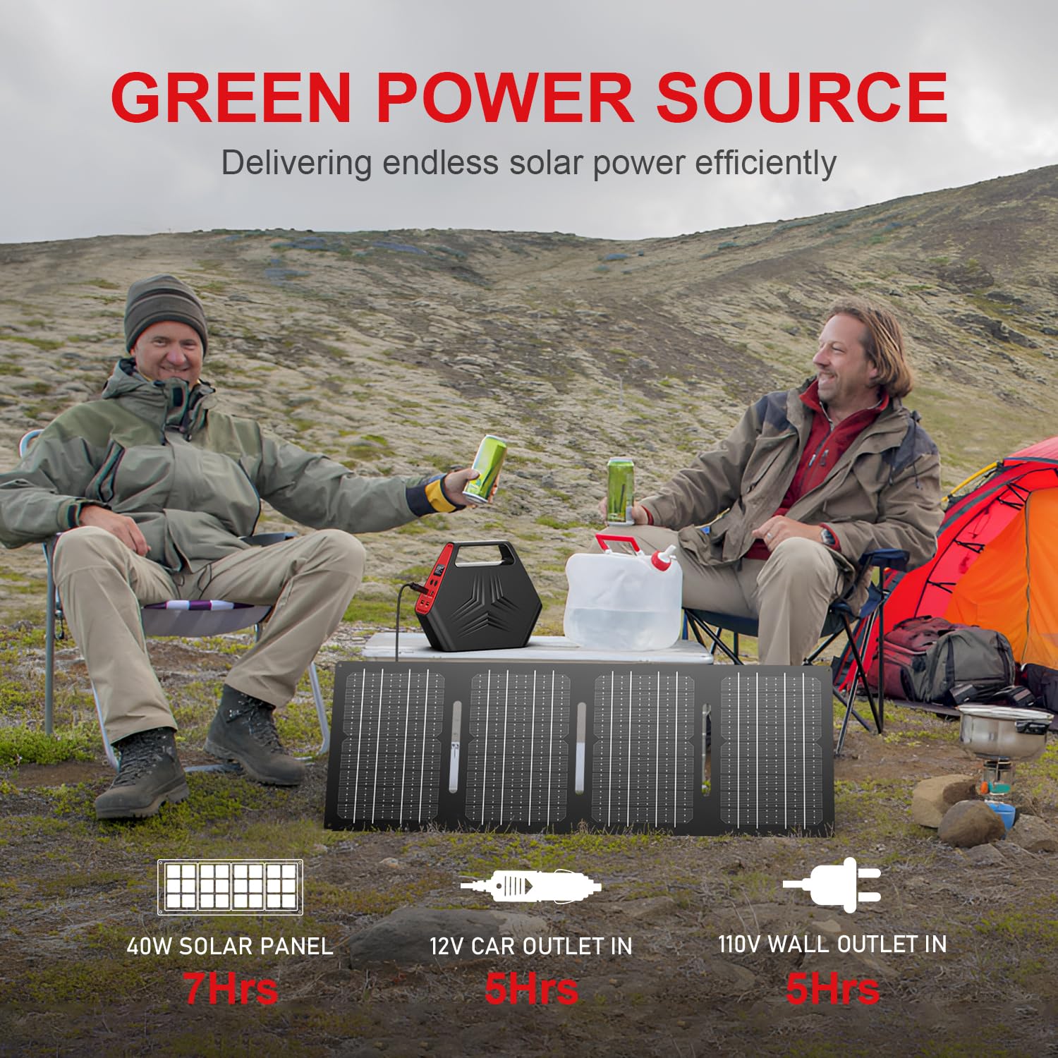 • What You Get: 1 x HP100 Portable power station,1 x Home charger,1 x Car cigarette lighter port connecting cable,2 x User manual,1 x 40W solar panel, 1 x 10in1 DC connector, 1 x DC cable