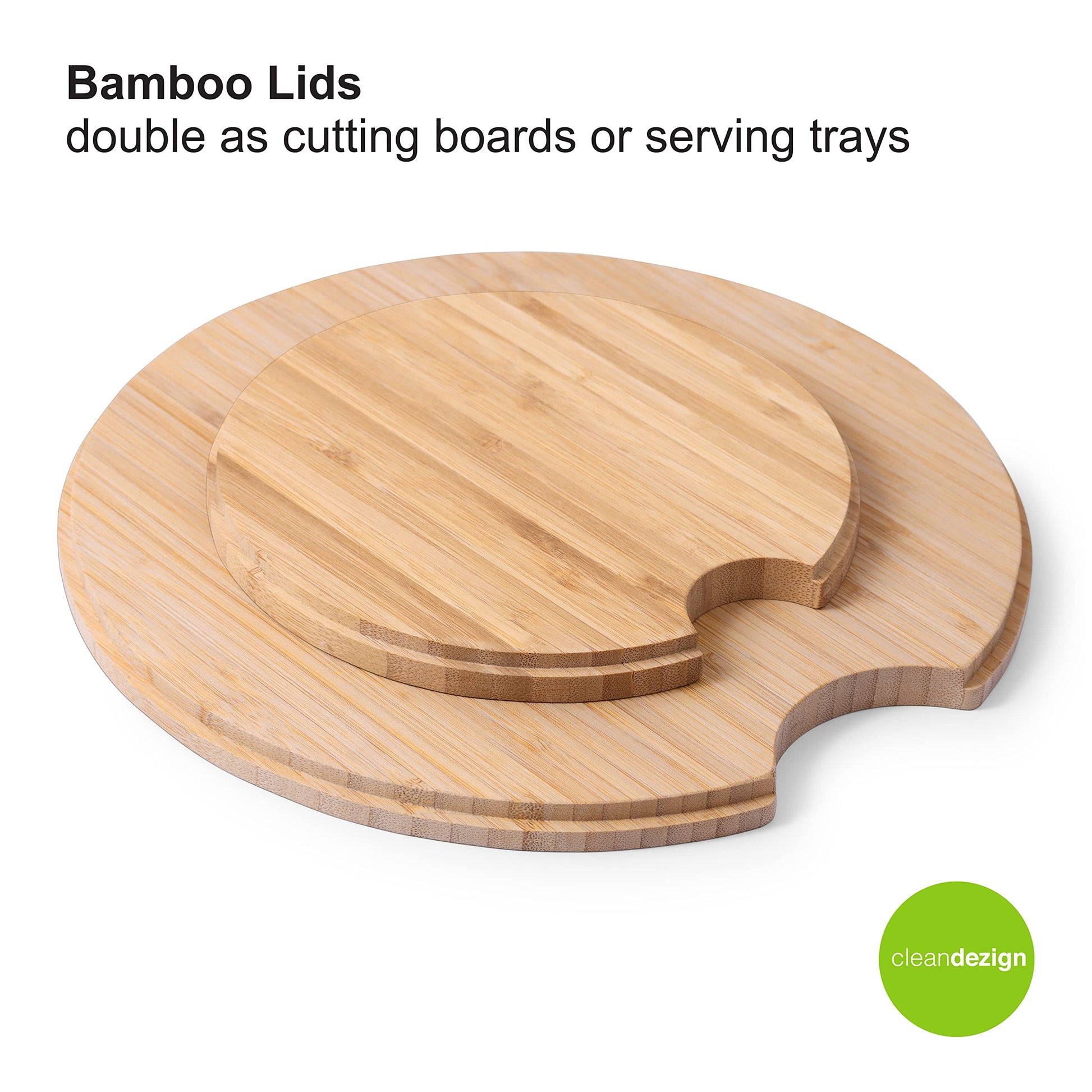 • Cutting Board Lid - Solid bamboo lids double as cutting boards for easy prep or as serving trays for charcuterie, breads, or fruits.