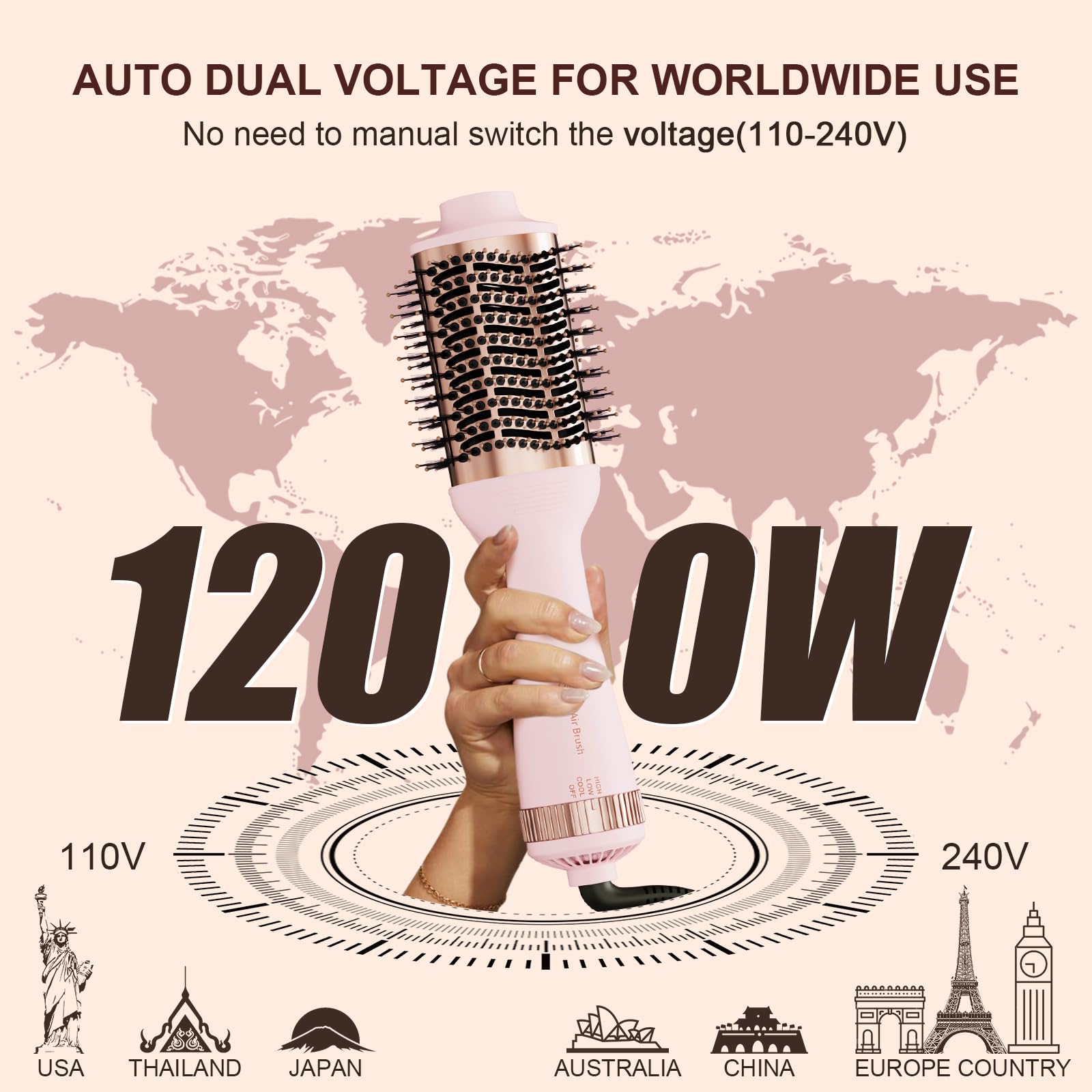 110-240V Travel Brush Hair Dryer, Small Hair Straightener Brush with European Plug Adapter for International Travel, 4 in 1 Hot Air Styler & Dryer for Drying Straightening Curling Volumizing