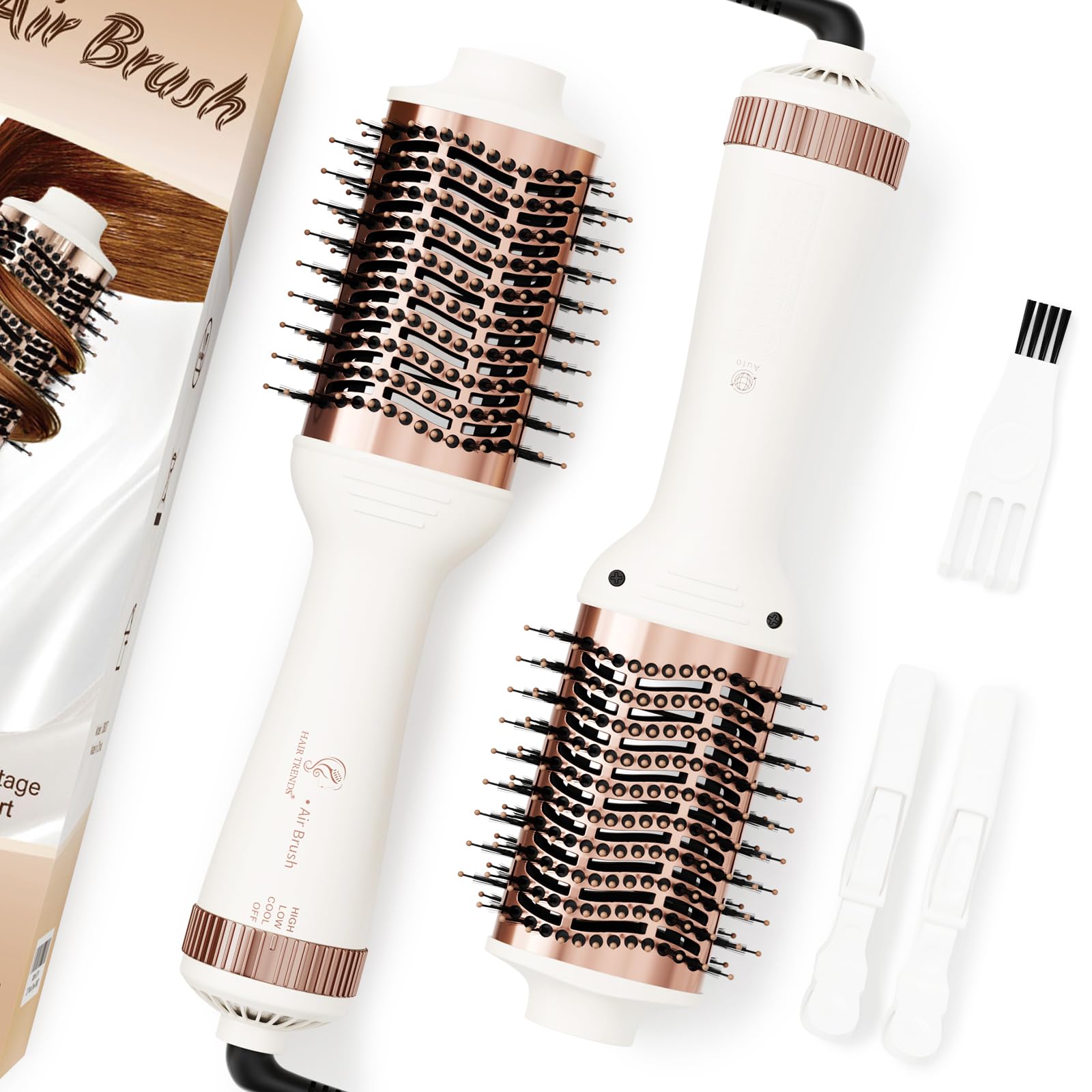 • 🎄【NANO TITANIUM TECHNOLOGY】 HAIR TRENDS Blowout brush hair dryer was made of Non-detachable nano titanium and tangle-Free combination bristles coating barrel, which can provide higher heat transfer for long-lasting hair styles. Besides, the special oval brush will make your hair in a good amount of lift at the root, smooth body and curled ends.