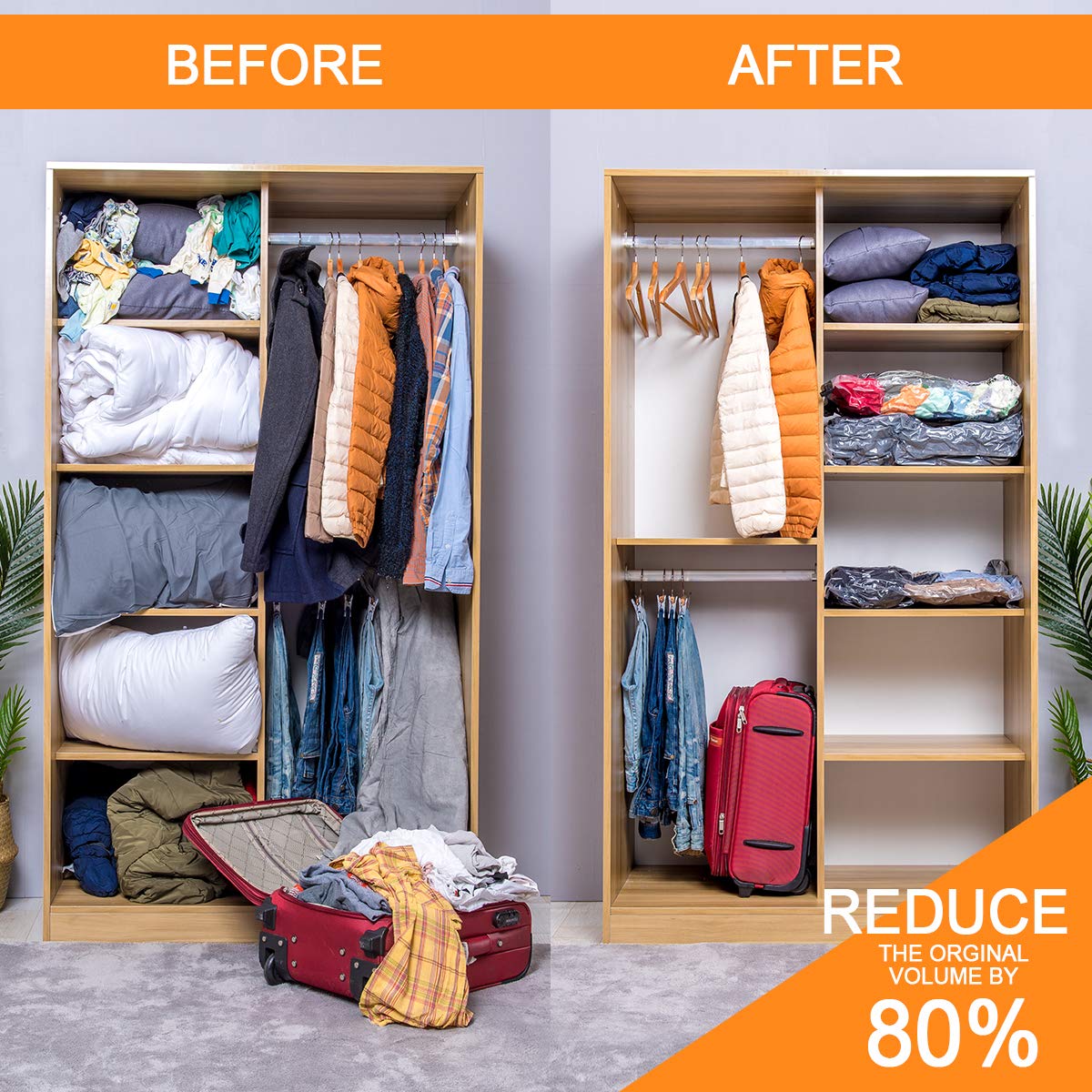 • Smart Compression, Lasting Defense: Built with industrial-grade thick plastic, our space saver plastic packaging bags combine a 4-point sealing system and reinforced edges. Crush bulky items to maximize closet space while shielding fabrics from dust, moths, and humidity for years.