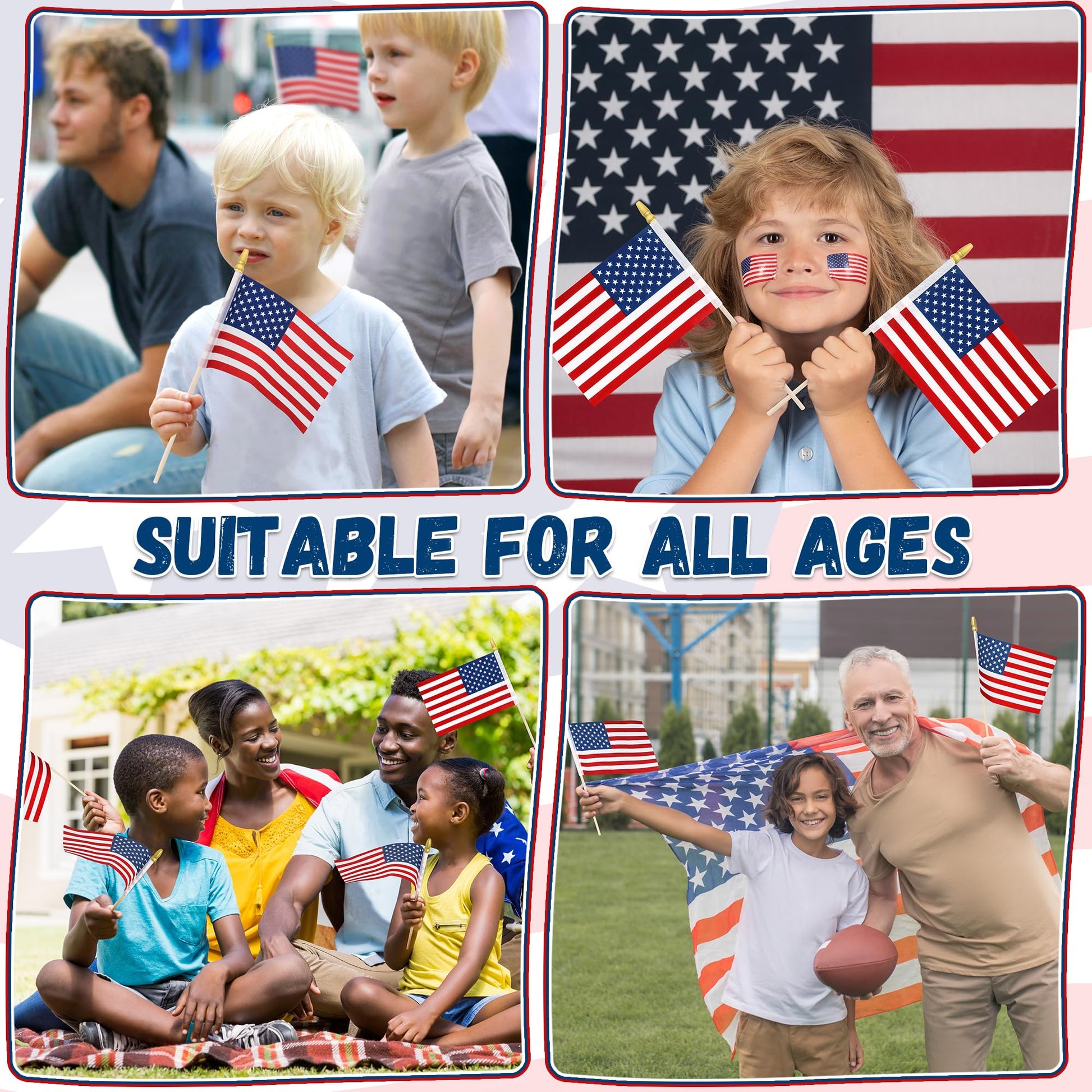 • Package Includes: Each package contains 12 pcs 4x6 inch small American flags, which can be placed in a cup or waved by hand to immediately create a patriotic atmosphere