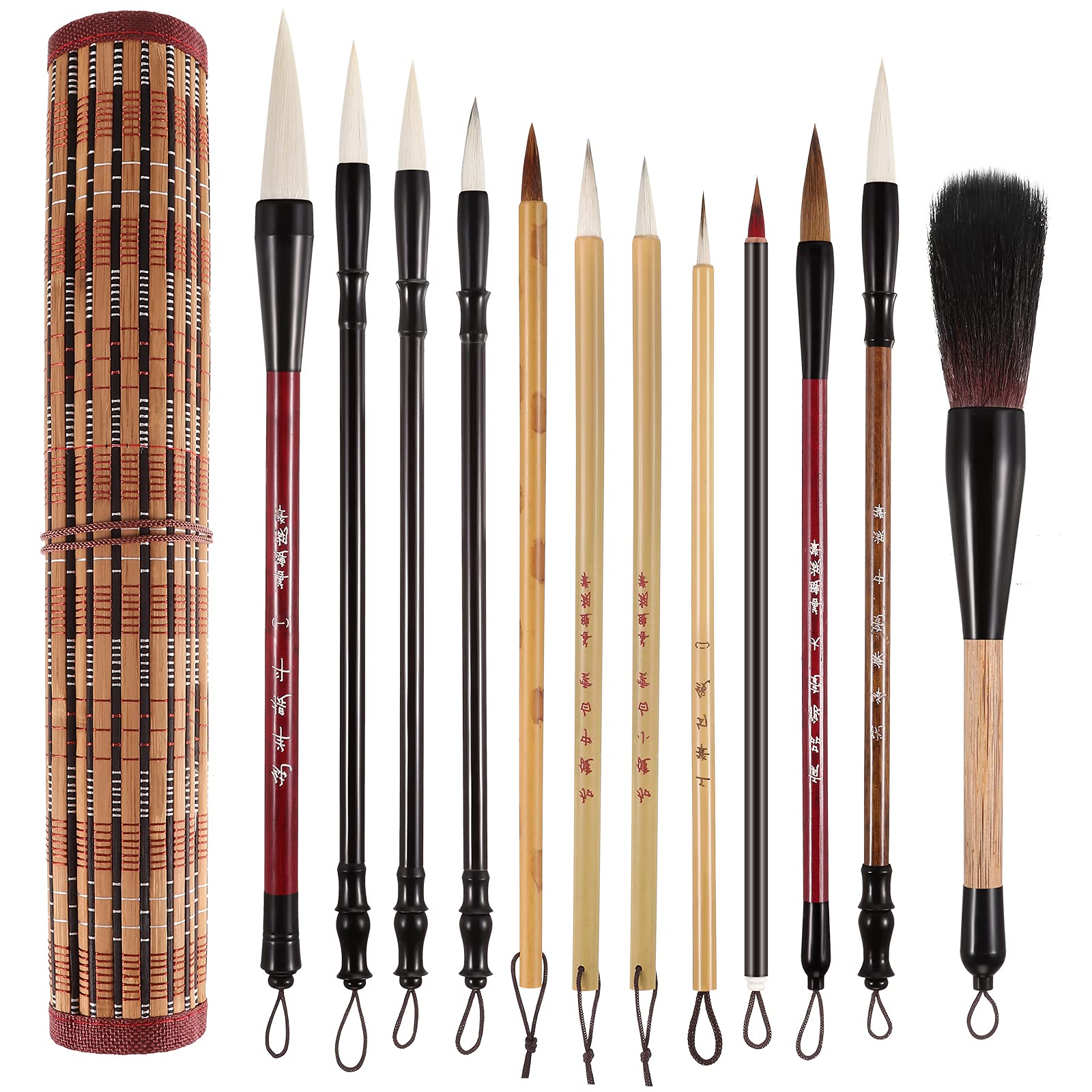 12 Pieces Chinese Calligraphy Brushes Painting Writing Brushes Watercolor Brushes Set Kanji Japanese Sumi Painting Drawing Brushes Kanji Art Brushes with Roll-up Brush Holder
