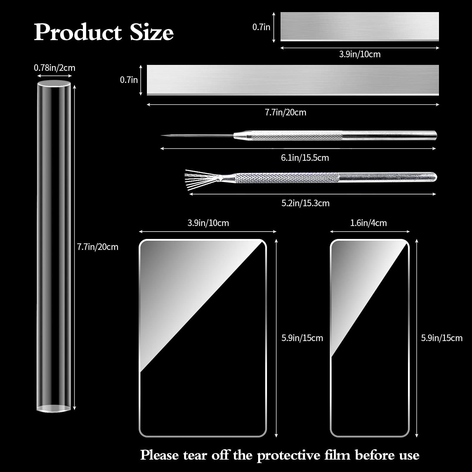 • 4 Acrylic Sheet: 2 size of the rectangular transparent acrylic sheets have a protective cover, please tear off the kraft paper before use.