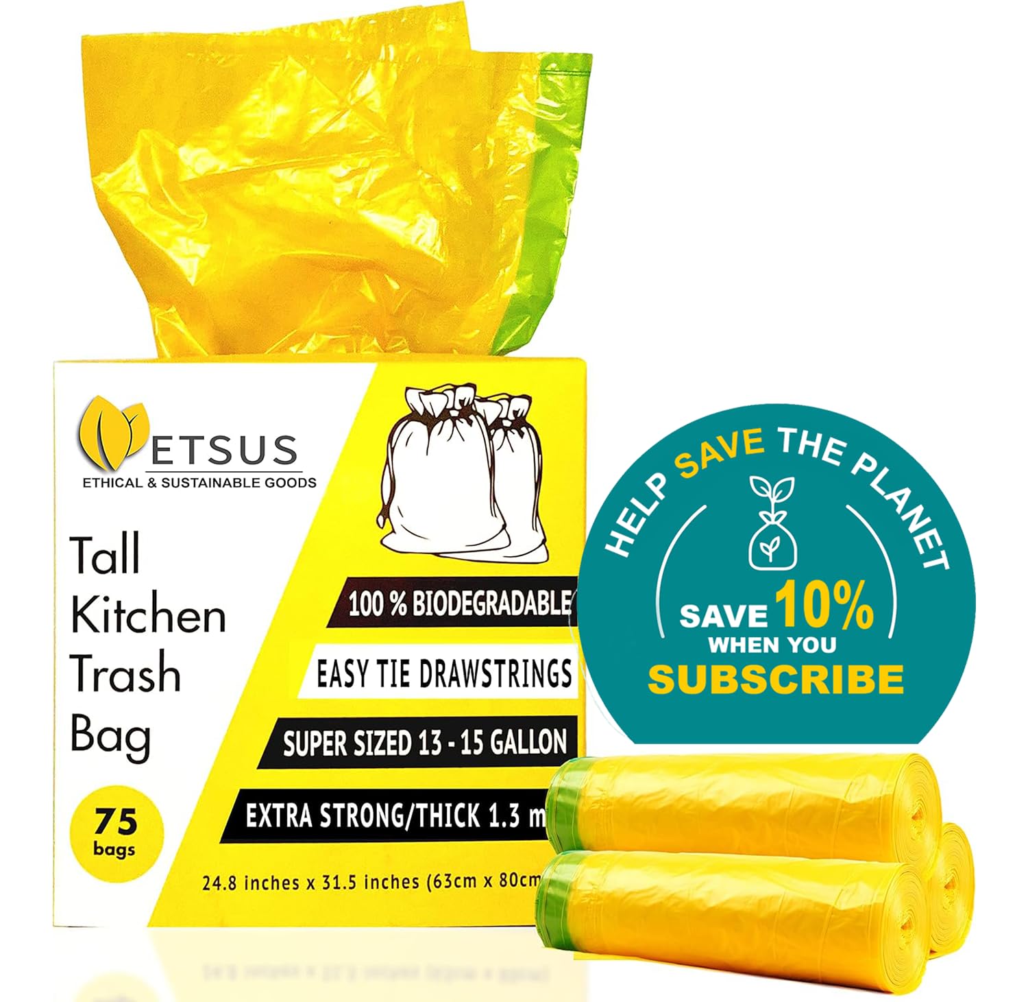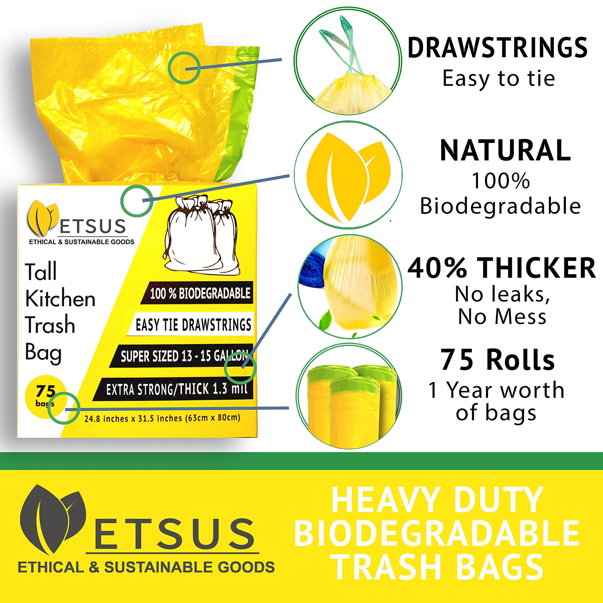 • DURABLE & LIGHTWEIGHT: If you love the convenience of trash bags but don’t want to throw away plastics then our 15 gal biodegradable trash bags have you covered. Each waste bag is 1.3 mil thick to make sure it’s durable enough to not tear or leak. We’ve also added easy tie drawstrings to make it even easier to throw them away