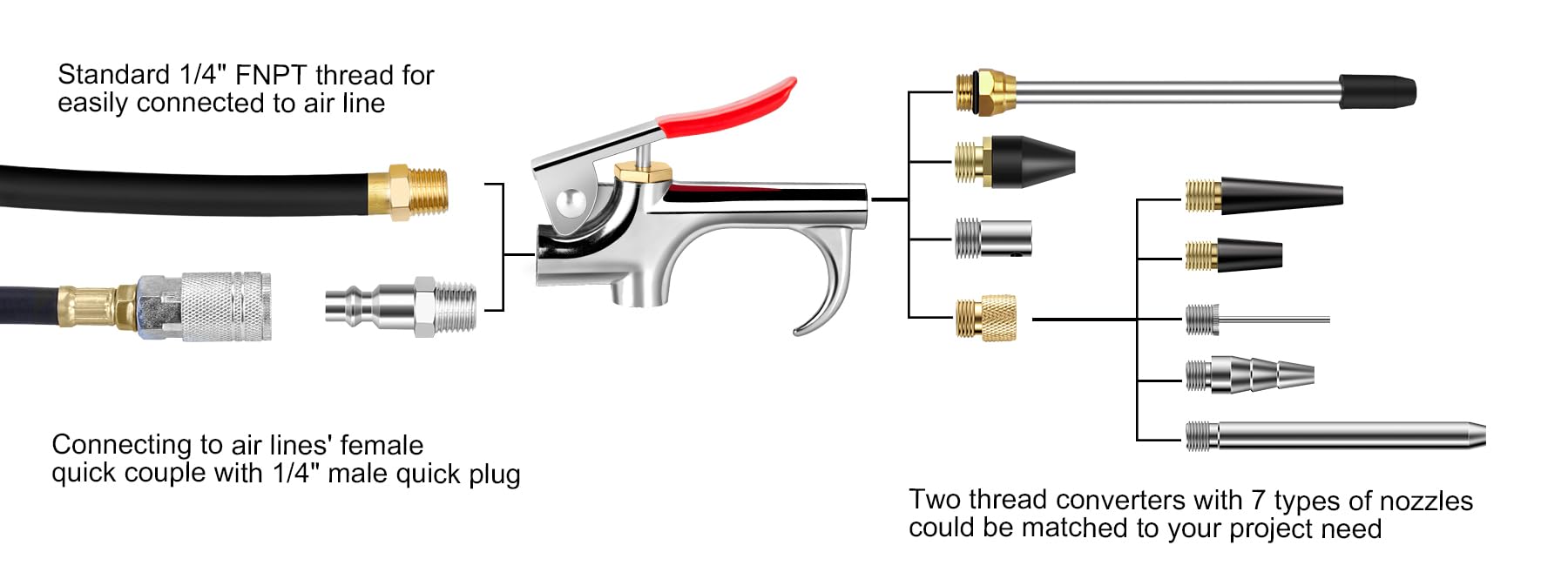 • 【2-Way Easy Connection】Premium air blow gun featured a female 1/4' NPT thread for easily connected to air lines of air compressor for air blowing. Also including a standard 1/4' male quick plug, for conveniently and swiftly connecting to the female quick couple of air lines.